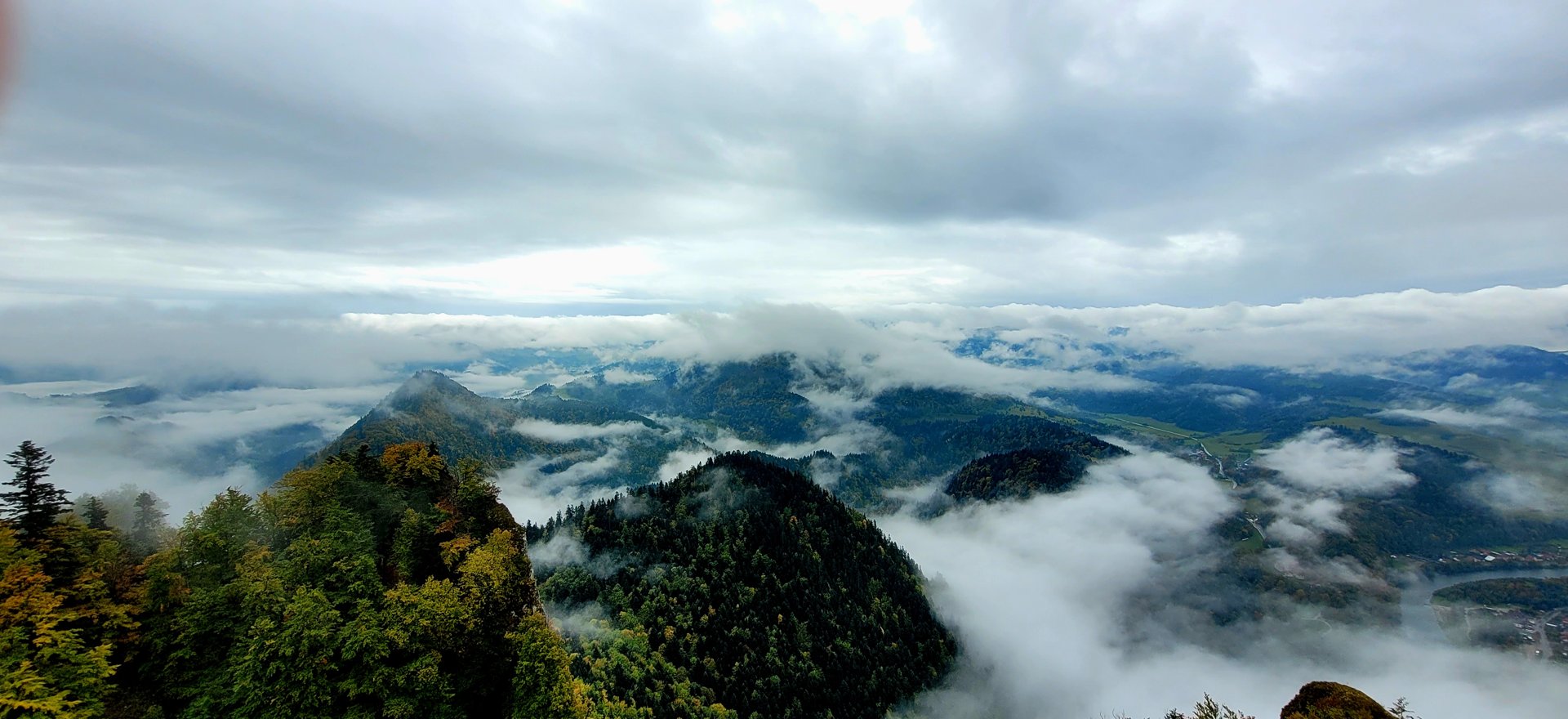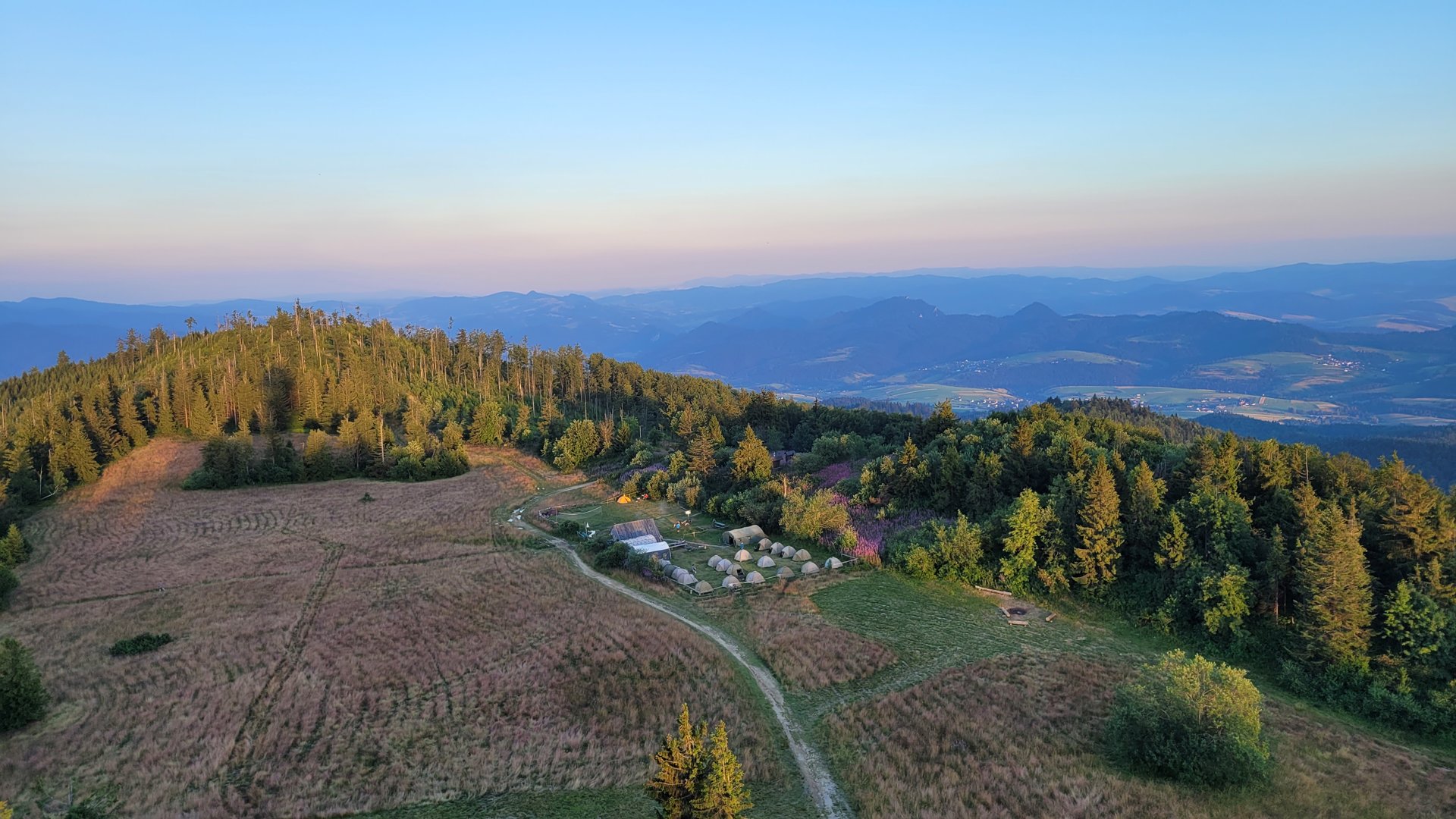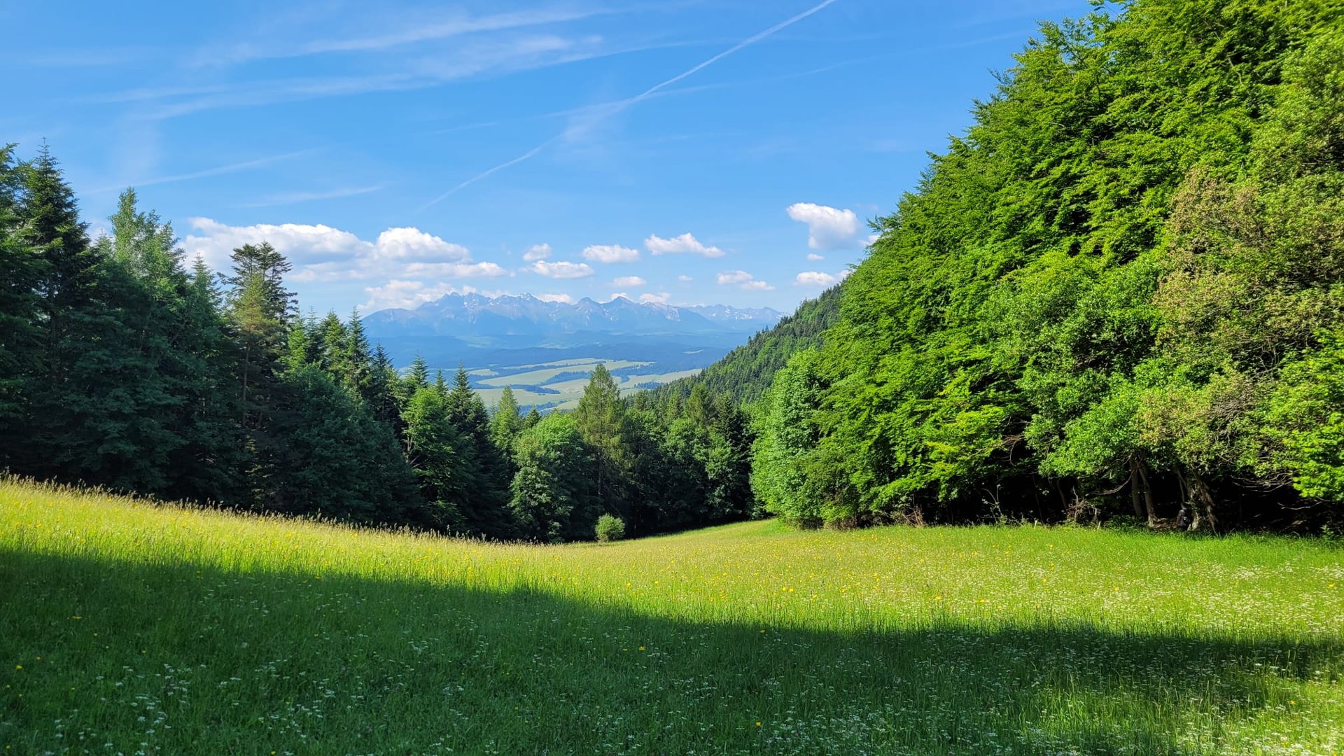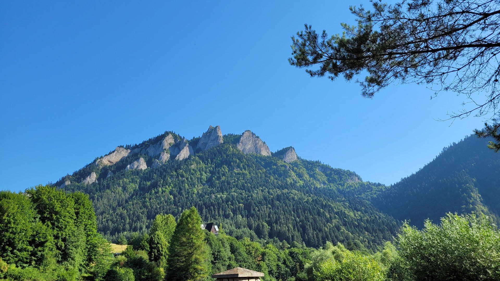 Pokój z łazienką oraz balkonem z widokiem na góry i lasy.